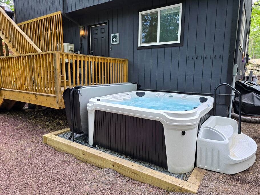 We invite you to experience a stay at the Hopskip Home LUXURY CHALET! -----KEY PROPERTY FEATURES----- • 3 BEDROOMS plus sleeping nook (2 queens, 1 twin bunk bed, 2 twins) • 2 FULL BATHROOMS with toiletries • New modern kitchen with quartz countertops and new appliances, fully equipped • Spacious and bright open concept living and dining area with high ceilings • Smart TVs, sound system, board games, toys • Expansive deck with dining area, Weber gas grill, lounge area with propane firepit • Yard with 7-person hot tub, wood firepit, Adirondacks and lawn games • Located in amenity filled lake community • Centrally located to many top attractions -----LOCATION, LOCATION, LOCATION! ----- AMENITY-FILLED PENN ESTATES COMMUNITY • Private, safe, gated community (community registration required - see "Guest Access" for more details) • Highland Lake with lake “beach” for swimming, kayaking and fishing (3 min drive to lake), scenic picnic pavillion • Tennis, pickle, basketball and volleyball courts • Children's playgrounds • Game Room with ping pong, pool and foosball tables • Archie's Corner, a convenience store/deli • Outdoor pools (summer season only, refer to POOL HOURS under "Guest Access" for more details) 10-20 MINUTE RADIUS • Downtown Stroudsburg & East Stroudsburg • Camelback, Aquatopia & Camelbeach • Delaware Water Gap • Pocono Premium Outlets • Mt. Airy Casino • Pocono Beverage Trail faves like Mountainview, Silverback, Shawnee Craft, Barley Creek and more! 25-35 MINUTE RADIUS • Kalahari Resort • Shawnee, Jack Frost & Big Boulder • Bushkill Falls • TreeVentures • Pocono Raceway and more! -----YOUR SUPERHOSTS----- Hi, we’re your Superhosts, Graham & Krista, a husband and wife team and owners of Hopskip Home, a collection of three vacation rental houses across the Poconos. We renovated and designed everything in the home for you to have a wonderful and thoughtful 5-STAR stay. (Psst, if this listing is booked for your preferred dates, check out our other AirBNB listings: the Hopskip Home Retro Chalet in Bushkill or the Modern Chalet in Pocono Lake) -----WHAT OUR GUESTS HAVE SAID----- “This was the perfect family-friendly spot. A modern gem! Comfortable felt like home… Graham & Krista were responsive and considerate... The guidebook Graham & Krista had was fantastic and had some great local recommendations… We look forward on returning again.” -Sabrina “We had a very good time in this lovely home. What a beautiful place, sitting on the balcony amidst the tree canopy in almost total silence was bliss.” -Jo-An "We loved the hot tub and the fire pit! We ate every meal out on the deck and saw deer every morning during breakfast. Great place to stay!!" -Gracie -----OUR TOP RECOMMENDATIONS----- • We have curated our top recommendations for you to have the best Pocono stay ever! • We can recommend our favorite nearby local and state parks, hiking trails, biking trails, fishing, river rafting, kayaking, skiing, golfing, horseback riding, wine tasting, ATVing, paintballing, rollerskating, bowling, zip lining and more! • We can also recommend fabulous restaurants, unique local shops, top attractions, happening nightlife spots, popular tours, fun festivals and more gems! -----MORE ABOUT YOUR VACATION CHALET----- EXTERIOR • Expansive deck with treetop views • Dining area with WEBER gas grill • Lounge area with propane firepit • 7-person hot tub with LED lights • Wood burning firepit with Adirondacks • Yard games: cornhole, ring toss, giant Connect 4, giant Jenga LIVING ROOMS • Main Living Room (upper level) and Lounge (lower level) • Smart HDTVs with Netflix, Disney+, Hulu and BOSE sound system • Board games: Jenga, Clue, Monopoly, Code Names, UNO, cards, poker chips and more • Note: both indoor fireplaces are for decorative only KITCHEN & DINING • Renovated kitchen with new cabinets, quartz countertops and appliances • Refrigerator, electric range/oven, dishwasher, microwave • Coffee maker, toaster, blender • Pots, pans, plates, bowls, utensils, cups, mugs, wine glasses, serveware and more • Children's dishware, utensils and high chair • Essentials provided: 1 roll paper towel, garbage bags, dish soap, dish tabs, sponge • Large indoor dining table seats 8 SLEEPING ACCOMMODATIONS • Primary Bedroom: queen bed, ensuite full bath, high ceilings • Bedroom 2: queen bed • Bedroom 3: 1 twin bunk bed + 1 twin bed • Sleeping Nook: twin day bed • Pack N Play travel crib (bring sheets) • Primary bedroom on upper level, all other bedrooms on lower level • New memory foam mattresses and fresh linens • Closets, hangers and drawers to unpack BATHROOMS • Two full bathrooms, fully renovated • Essentials provided: 1 bath towel per guest, hand soap, shampoo, conditioner, body wash, hair dryer MORE FEATURES • Hopskip Home online Welcome Book with our top curated recommendations (we've almost tried it all for you!) • Pocono guidebooks • On-site parking for up to 4 cars • Air conditioning (mini splits) & heating (mini splits and electric baseboards) • Full-sized washer and dryer • Free Wi-Fi, dedicated work desk in Primary Bedroom • Mudroom rack and coat closet • Note: home has a spiral staircase with baby gate at the top; it is easiest to use the deck stairs to bring in groceries and bags