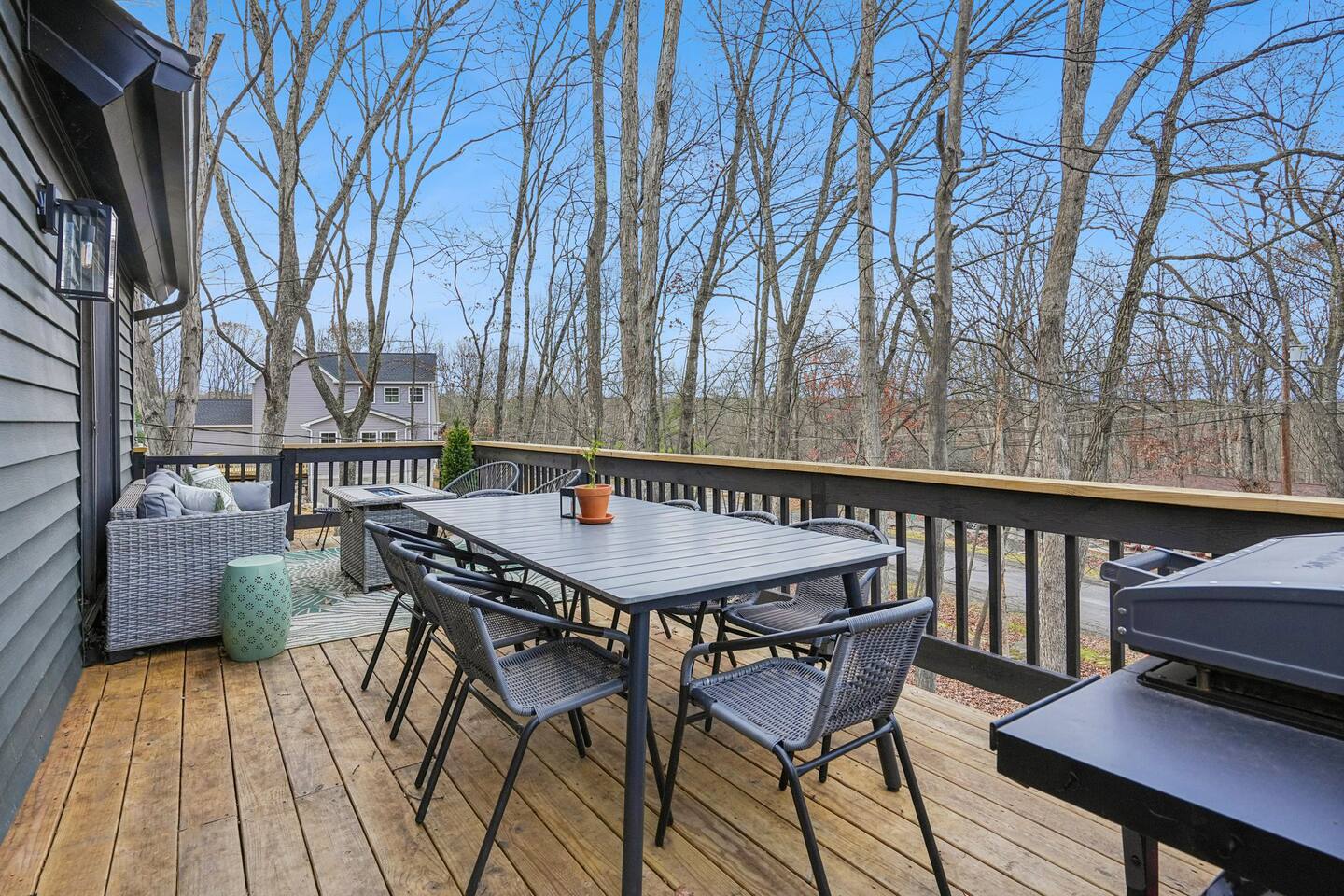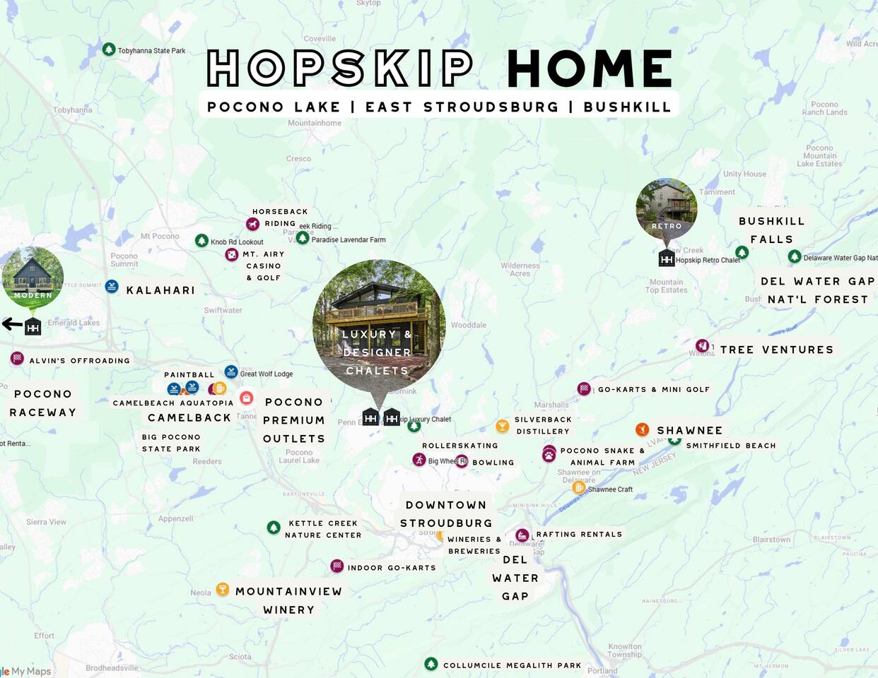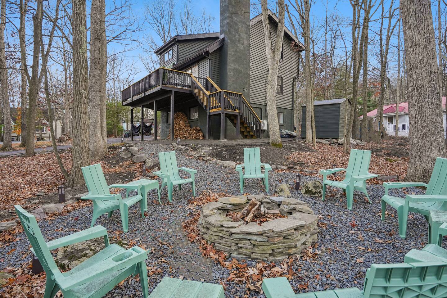 We invite you to experience a stay at the Hopskip Home DESIGNER CHALET! -----KEY PROPERTY FEATURES----- • 5 BEDROOMS, sleeps 10 • 3 FULL BATHROOMS with toiletries • New modern kitchen with quartz countertops and new appliances, fully equipped • Open concept living and dining area with high ceilings • Karaoke Lounge with stage, lights, microphones and TV for music videos with lyrics • Movie Lounge with 85” HDTV • Smart TVs, sound system, board games, toys • Expansive deck with dining area, gas grill, lounge area with propane firepit • Yard with built-in wood firepit, Adirondacks and swing chairs • Located in amenity filled lake community • Centrally located to many top attractions -----LOCATION, LOCATION, LOCATION! ----- AMENITY-FILLED PENN ESTATES COMMUNITY • Private, safe, gated community (community registration required - see "Guest Access" for more details) • Highland Lake with lake “beach” for swimming, kayaking and fishing (3 min drive to lake), scenic picnic pavillion • Tennis, pickle, basketball and volleyball courts • Children's playgrounds • Game Room with ping pong, pool and foosball tables • Archie's Corner, a convenience store/deli • Outdoor pools (summer season only, refer to POOL HOURS under "Guest Access" for more details) 10 TO 20 MINUTE RADIUS • Downtown Stroudsburg & East Stroudsburg • Camelback, Aquatopia & Camelbeach • Delaware Water Gap • Pocono Premium Outlets • Mt. Airy Casino • Pocono Beverage Trail faves like Mountainview, Silverback, Shawnee Craft, Barley Creek and more! 25 TO 35 MINUTE RADIUS • Kalahari Resort • Shawnee, Jack Frost & Big Boulder • Bushkill Falls • TreeVentures • Pocono Raceway and more! -----YOUR SUPERHOSTS----- Hi, we’re your Superhosts, Graham & Krista, a husband and wife team and owners of Hopskip Home, a collection of four vacation rental houses across the Poconos. We renovated and designed everything in the home for you to have a wonderful and thoughtful 5-STAR stay. Psst, if this listing is booked for your preferred dates, check out our other Hopskip Home AirBNB listings: (1) Hopskip Luxury Chalet in East Stroudsburg (located 1 house away) (2) Hopskip Retro Chalet in Bushkill or (3) Hopskip Modern Chalet in Pocono Lake -----OUR TOP RECOMMENDATIONS----- • We have curated our top recommendations for you to have the best Pocono stay ever! • We can recommend our favorite nearby local and state parks, hiking trails, biking trails, fishing, river rafting, kayaking, skiing, golfing, horseback riding, wine tasting, ATVing, paintballing, rollerskating, bowling, zip lining and more! • We can also recommend fabulous restaurants, unique local shops, top attractions, happening nightlife spots, popular tours, fun festivals and more gems! -----MORE ABOUT YOUR VACATION CHALET----- EXTERIOR • Expansive deck with treetop views • Dining area with gas grill • Lounge area with propane firepit • Built-in wood burning firepit with Adirondacks LIVING ROOMS • Main Living Room (middle level) and Lounge (lower level) • Smart HDTVs with Netflix, Disney+, Hulu • Board games and card games • Note: indoor fireplace is for decoration only KITCHEN & DINING • Renovated kitchen with new cabinets, quartz countertops and appliances • GE Café refrigerator, electric range/oven, dishwasher, microwave • Coffee maker, toaster, blender • Pots, pans, plates, bowls, utensils, cups, mugs, wine glasses, serveware and more • Children's dishware, utensils and high chair • Essentials provided: 1 roll paper towel, garbage bags, dish soap, dish tabs, sponge • Large indoor dining table seats 10 SLEEPING ACCOMMODATIONS • Primary Bedroom: queen bed, high ceilings (upper level) • Bedroom 2: full bed (upper level) • Bedroom 3: full bed (upper level) • Bedroom 4: full-over-full bunk bed (middle level) • Bedroom 5: queen bed (lower level) • Pack N Play travel crib (bring sheets) • New memory foam mattresses and hotel-quality linens • Closets, hangers and drawers to unpack BATHROOMS • Three full bathrooms, fully renovated • Essentials provided: 1 bath towel per guest, hand soap, shampoo, conditioner, body wash, hair dryer MORE FEATURES • Hopskip Home online Welcome Book with our top curated recommendations (we've almost tried it all for you!) • Pocono guidebooks • On-site parking for up to 5 cars • Air conditioning (mini splits) & heating (mini splits and electric baseboards) • Full-sized front loader washer and dryer • Free Wi-Fi, dedicated work desk in Bedroom 2 • Mudroom bench, hooks and coat closet Guest access ***MANDATORY COMMUNITY REGISTRATION*** • Guests must e-sign a mandatory Penn Estates Community Short-Term Registration Form prior to arrival to gain access into the community • Form will be sent upon booking. You will need to provide your email, full names of all guests, if under/over age 21 and all cars (max 4 cars). • The HOA registration fee is included in your total price • If you do not complete the registration by 5pm at least 3 days prior to arrival, the HOA charges an extra $25 expedited registration fee which you would be responsible for • If you need to modify your registration form after it has been submitted to the HOA, there is a $25 re-registration fee • No modifications can be made to registered guests and cars within 24hrs prior to arrival • POOL HOURS: please message to confirm outdoor pool hours. Outdoor pools are open daily from 06/21/25 to Labor Day, generally from 11am-8pm. Outdoor pools are open on weekends only from Memorial Day weekend to 06/20/25. ***PROPERTY USE & LIABILITY WAIVER*** Guests will also need to e-sign a property use and liability waiver to use the house amenities including the firepits.